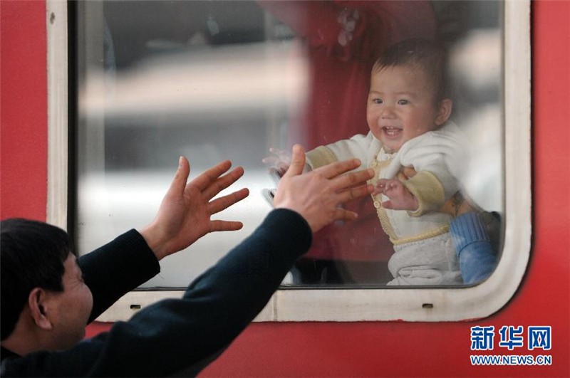Le 26 janvier 2013, à la gare de Hangzhou, Yang s'amuse avec son petit-fils à travers la fenêtre du train.