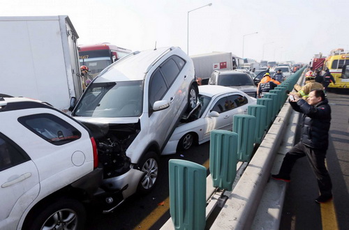 La collision est survenue au matin sur une voie en direction de Séoul et a probablement été aggravée par un épais brouillard et les conditions routières glacées. Mais on ne sait pas encore clairement ce qui a provoqué le carambolage. Lee Gyeong-hoon, un chauffeur de 39 ans dont la voiture a été impliquée dans l'accident, a déclaré qu'il conduisait lentement parce que le brouillard l’empêchait de voir beaucoup plus loin que 10 mètres devant lui. ? J’ai vu les feux de freinage de la voiture en face de moi s’allumer et je me suis arrêté brusquement ?, a déclaré M. Lee, dont la voiture a été percutée par derrière. Il a réussi à ouvrir la porte et à s’échapper sur le c?té.