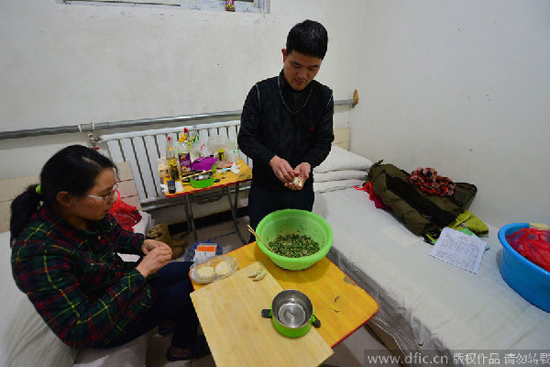 | Zhang Min, qui est traitée pour un cancer de la peau, prépare des boulettes de viande avec son mari, le 5 février 2015. [Photo: Imagine China]. |