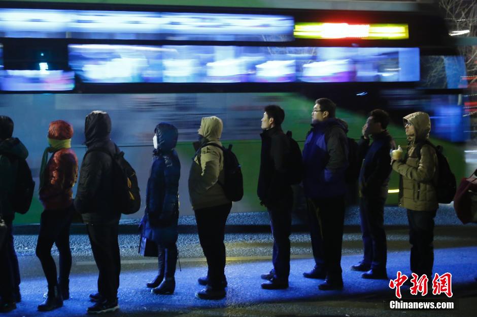 Le 2 février 2015 à 5h30, à l'arrêt du bus 814 à Toptown, un quartier de résidences à Yanjiao. Le bus part tous les cinq minutes. (Photo Wang Jun)