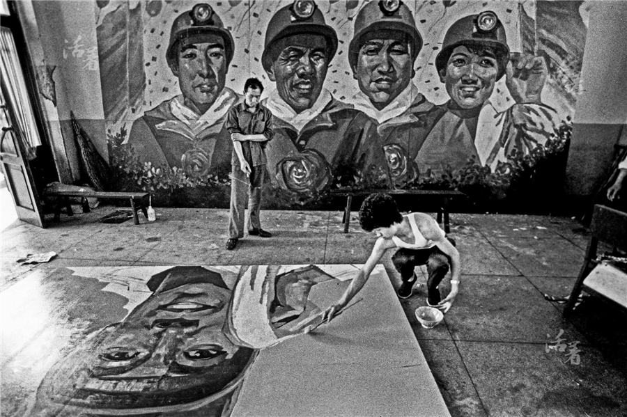 [Publicité] Les mineurs de la Shiqijie Coal Mine, dans la province du Shanxi, peignent des affiches pour la promotion de leur lieu de travail. Image prise dans les années 80. A cette époque, cette mine a été désignée par les autorités comme une référence nationale pour montrer l'exemple à d'autres sites. [Photo/news.qq.com]