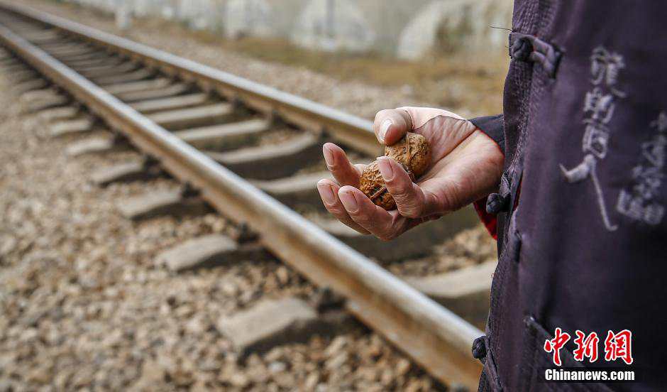 Photo prise le 21 mars. Un vieil homme jouant avec des noyers marche sur la voie de chemin de fer, un itinéraire qui le ramènera jusque chez lui. [Photo/Zhang Hao, China News]
