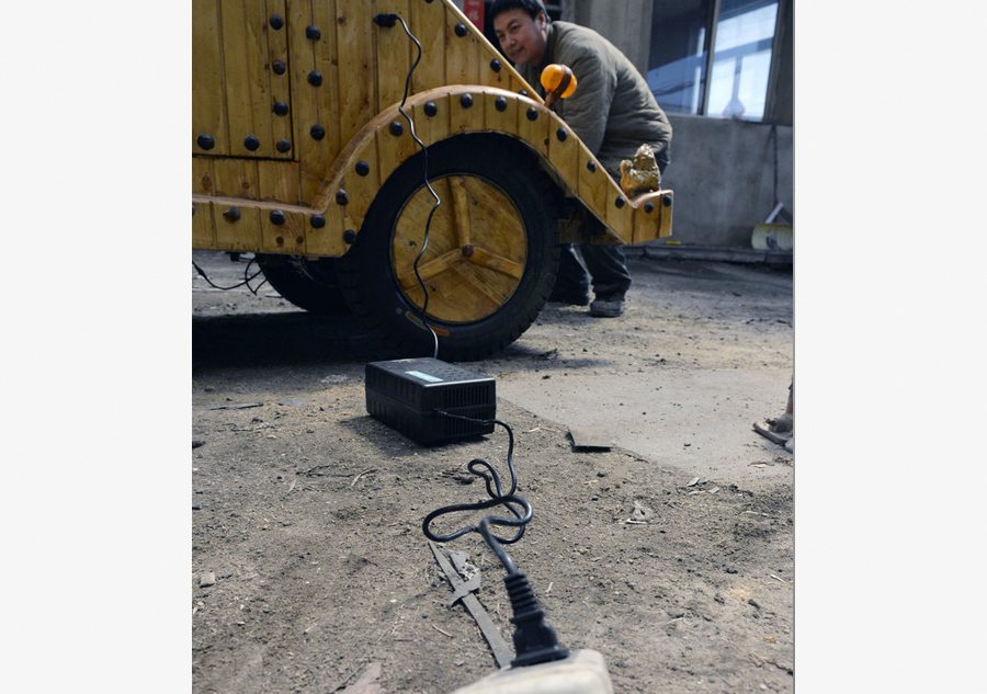 Liu Fulong, pendant la charge électrique de son bolide en bois. [Photo/CFP]