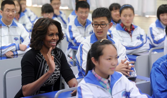 Le 25 mars 2014, présence de Michelle Obama à l'école N.7 de Chengdu, qui s'est entretenue à distance avec des élèves de l'école N.2 de Wenjiang.