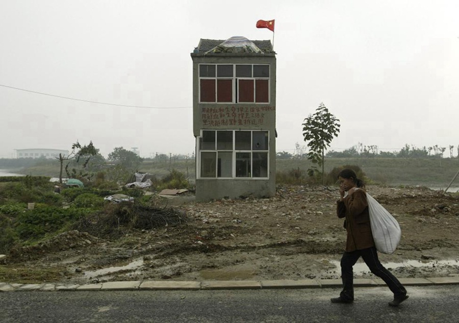 Une femme passe devant une ? maison clou ?, la dernière encore debout du quartier, dans la périphérie de Nanjing, la province du Jiangsu, le 31 octobre 2008. [Photo / Reuters]