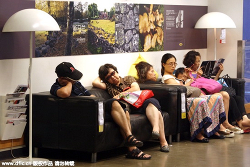Plusieurs clients ont pris place sur un canapé pour profiter de l'air frais et échapper à la chaleur de plomb, dans un IKEA à Shanghai, le 6 ao?t 2013.