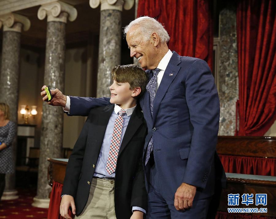 Le vice-président américain Joe Biden tout sourire, pour un selfie avec le petit-fils de la députée Jeanne Shaheen, au congrès américain, le 6 janvier 2015.