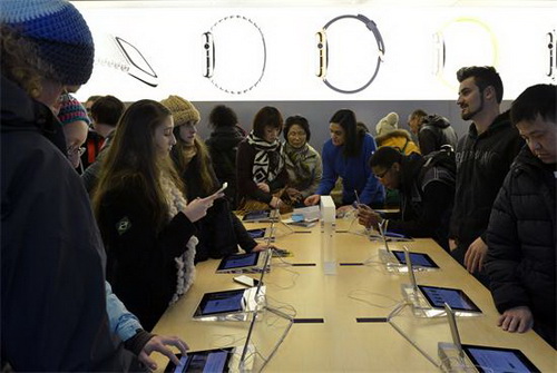 Des clients à l'Apple Store de la Cinquième Avenue, à New York, le 9 avril 2015. [Photo / Xinhua]