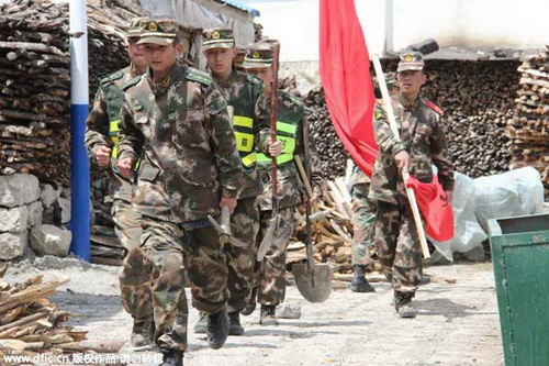 | Intervention des secouristes dans le comté de Gyirong, la région région chinoise autonome du Tibet, le 26 avril 2015. [Photo/IC] |
