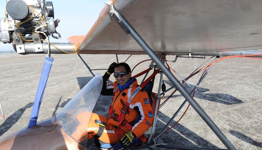 Yang, agé de 45 ans, a effectué par le passé deux vols d'essai, et a réussi à voler pendant une durée totale de 2,5 heures. L'homme a baptisé son avion ? Jinhai ? qui est le prénom de son père, et a l'intention de construire dans le futur plusieurs biplaces. [Photo/ECNS]