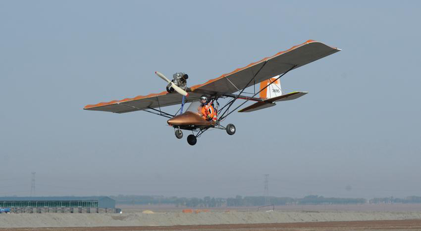 Yang Shijun pilote le coucou qu'il a créé de ses propres mains, jusqu'à une altitude de 200 mètres à Changchun, dans la province de Jilin (nord de la Chine), le 10 mai 2015. [Photo/ECNS]