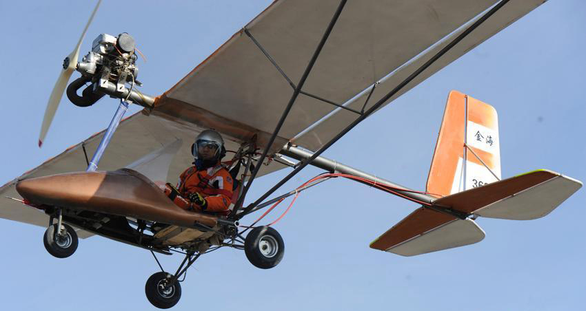 Yang Shijun pilote le coucou qu'il a créé de ses propres mains, jusqu'à une altitude de 200 mètres à Changchun, dans la province de Jilin (nord de la Chine), le 10 mai 2015. [Photo/ECNS]
