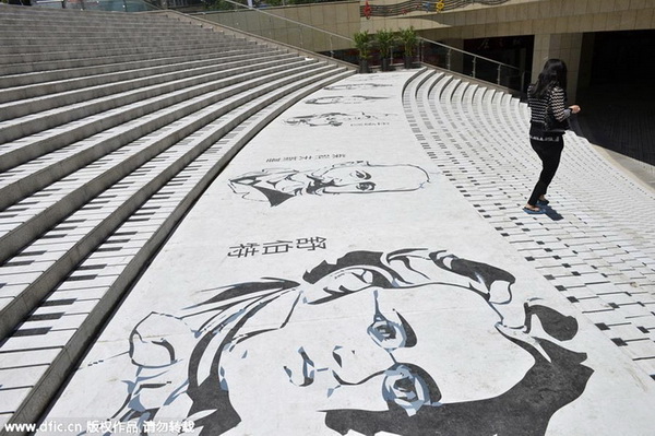 Une femme marche sur des escaliers peints comme des touches de piano avec des portraits de compositeurs célèbres, dont Ludwig van Beethoven et Franz Schubert, en face d'un centre commercial souterrain de la ville de Luoyang, dans la Province du Henan en Chine centrale, le 12 mai 2015. [Photo / IC]