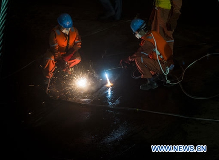 Selon Li Qixiu, ingénieur de l'Université de Nanjing, le fond de l'étoile de l'Orient sera découpé en même temps que la coque sera hissée grace à des cables en acier.