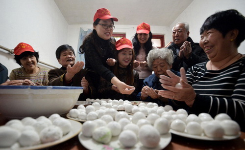 | Ainés et bénévoles préparent les fameuses Yuan Xiao, l'aliment typique du Festival des Lanternes Festival, à Handan, la province du Hebei, le 3 mars 2015. [Photo/IC] |