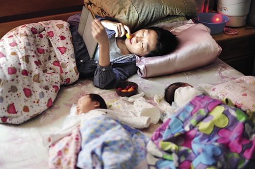 Hu Yue se repose avec ses deux nourrissons agés de 33 jours.