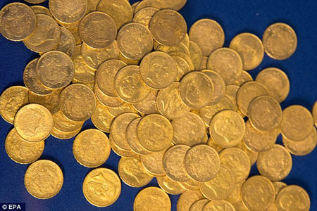 A l'époque, la Reichsbank dispersé de vastes quantités d'or, d'argent et d'argent dans des cachettes secrètes à travers l'Allemagne tandis que Berlin s'écroulait sous l'assaut des bombardiers alliés. Les pièces de monnaie ont un diamètre de 21 millimètres et pèsent 6,45 grammes chacune. Selon Mario Pahlow, un archéologue local, les pièces de monnaie, qui sont en ? bon état ? et ne l'ont pas encore été revendiquées, valent entre 190 Euros et 210 Euros chacune, amenant la collection a une valeur d'environ 45 000 Euros. Si les pièces ont été trouvées en octobre dernier, la découverte vient seulement d'être rendue publique et sera présentée au Musée de Lunebourg.
