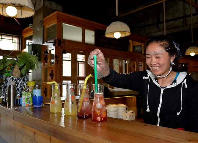 Une employée de l'? Accordéon ? prépare des boissons froides pour les clients, le 28 juillet 2015. [Photo / Xinhua]