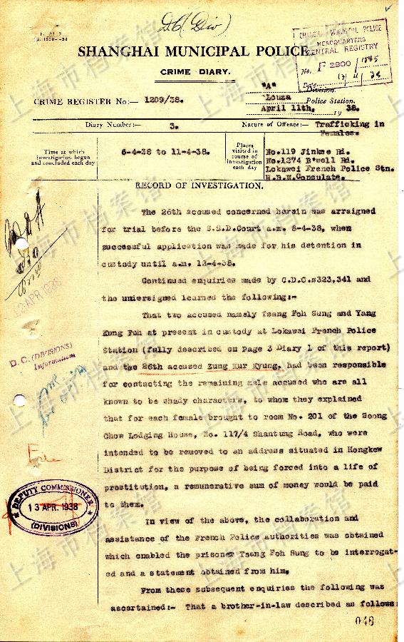 En avril 1938, des individus pro-japonais au service de l'armée japonaise ont attiré des femmes chinoises dans des h?tels situés dans l'arrondissement de Hongkou à Shanghai,avant de les revendre comme "femmes de réconfort" à l'armée japonaise, selon les rapports d'enquêtes sur les crimes de l'année 1938 de la station de police de la concession internationale de Shanghai.