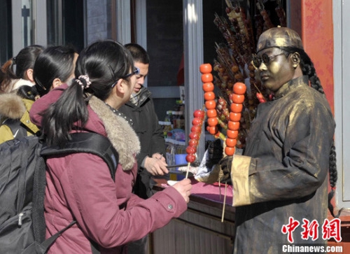 Vendue sur des brochettes, cette gourmandise qui se mange sur le pouce est belle à voir et meilleure encore à manger. Ce sont de petites pommes rouge vif alignées sur une brochette dans une formes de bon augure, avec une couche extérieure sucrée scintillant dans la lumière. [Photo / Chinanews.com]