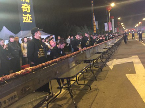 Un total de 2500 personnes se sont réunies pour partager un kebab géant d'une longueur de 194,5 m dans un h?tel à Langfang, la province du Hebei (nord de la Chine), le 24 octobre 2015.
