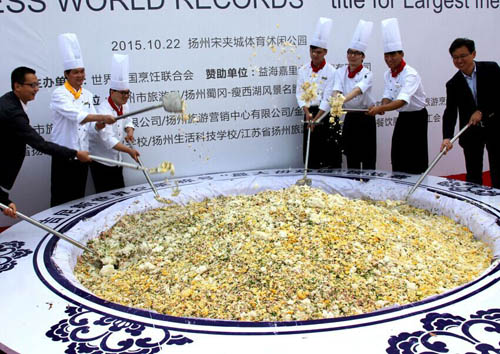 La ville de Yangzhou, qui fêtait son 2500e anniversaire cette année, est célèbre pour son rit frit assaisonné avec différents ingrédients, comme le boeuf et le concombre de mer. A l'occasion de cette fête, l'Association mondiale de la cuisine chinoise à Yangzhou a tenté de battre le record du monde de la plus grande portion de riz frit (plus de quatre tonnes) pour servir environ 300 personnes.