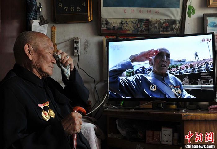 Un vétéran chinois originaire de Cangzhou, dans la province du Hebei, en pleurs devant la retransmission en direct de la cérémonie marquant le 70e anniversaire de la fin de la Seconde guerre mondiale et de la guerre de résistance du peuple chinois contre l'agression japonaise (1937-1945). [Photo/China News Service]
