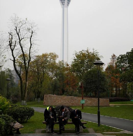 Trois hommes s'amusent avec leur mobile dans un parc de Chengdu (sud-ouest de la Chine), le 4 décembre 2015. (Photo/gmw.cn)