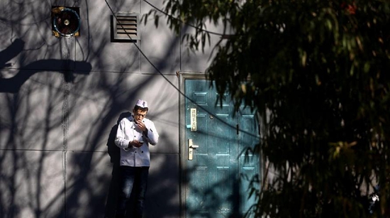 A Beijing, un chef joue sur son téléphone mobile pendant sa pause, le 16 décembre 2015. (Photo/gmw.cn)