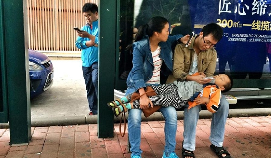 Un couple s'amuse avec leur smartphone en attendant le bus à Guangzhou dans le sud de la Chine, le 12 décembre 2015. (Photo/gmw.cn)