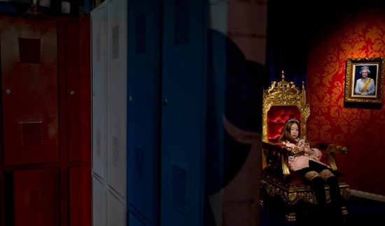 Assise sur le tr?ne de la reine, une jeune fille joue à un jeu sur son mobile dans le Wax Museum à Wuhan, la province du Hubei (centre de la Chine), le 10 décembre 2015. (Photo/gmw.cn)