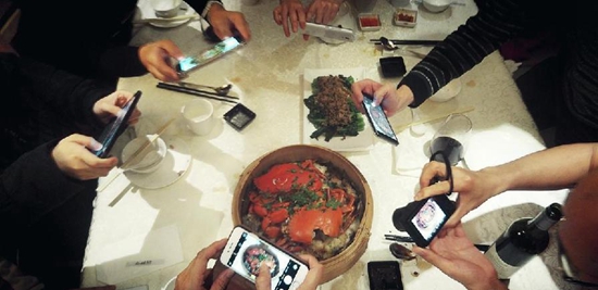 Les convives prennent des photos des plats avec leur smartphone à Hong Kong, le 16 décembre 2015. (Photo /gmw.cn)