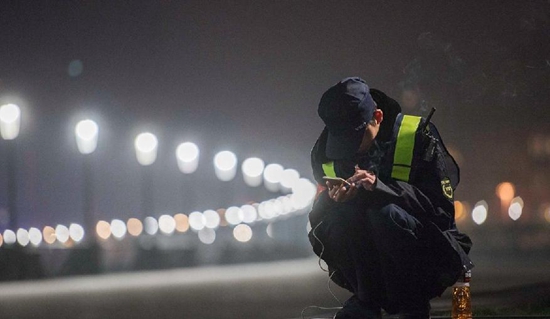 Un agent de sécurité joue sur son portable au Bund de Shanghai, le 14 décembre 2015. (Photo/gmw.cn)