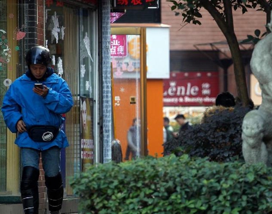 Un employé vérifie les informations sur son téléphone en livrant des plats, à Changsha, dans la province du Hunan (centre de Chine), le 27 décembre 2015. (Photo/gmw.cn)