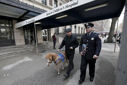 Handler Jorge Garcia-Bengochea (à droite) aux c?tés de Honneur, un cheval nain faisant partie du projet de la Gentle Carousel Miniature Therapy Horses, accueillis par le Dr Lisa Satin, présidente du service de pédiatrie du système de santé Mount Sinai, lors d'une visite des patients de l'H?pital Kravis pour enfants du Mont Sina? dans le quartier de Manhattan à New York, le 16 mars 2016. [photo/Agences]