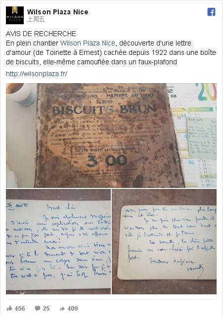 | Sur le chantier du grand h?tel Wilson Plaza, à Nice, des ouvriers ont découvertune lettre d'amour rédigée par une mystérieuse cliente. (Photo / Facebook) |