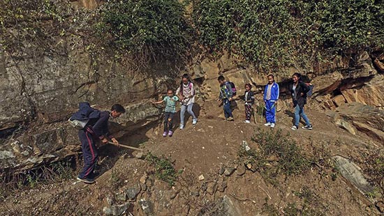 Le 19 novembre 2019, des enfants grimpent à une échelle. Après l’école, un passage obligatoire qui leur prend plus de deux heures pour rentrer chez eux.