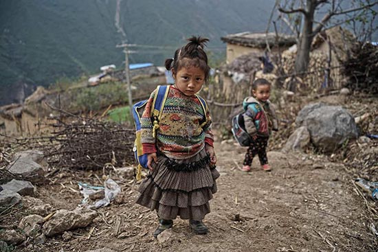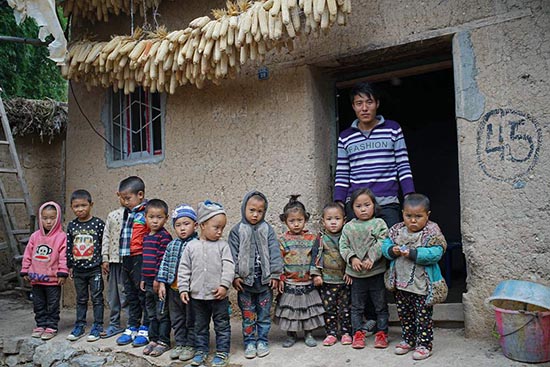 Photo de famille de l’enseignant Chen Long et de ses 13 élèves, le 14 novembre 2016. Vivant dans un autre village, il lui faut plus de 4 heures par jour pour se rendre à l’école.