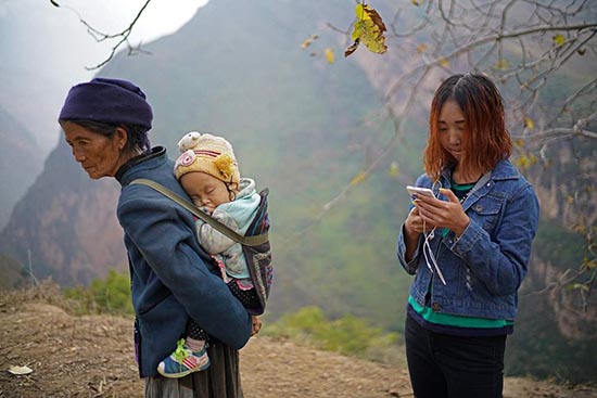 Fangfang utilise son mobile sur le site, le seul endroit à capter le réseau dans ce village reculé. Elle a d? quitter les siens pour trouver du travail, et revient seulement une fois par an à l’occasion du Nouvel An du Yi.