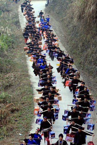 Plus de 200 femmes de l'ethnie Miao, accompagnées de leurs maris, sont revenues dans leur ville natale dans la préfecture autonome Miao et Dong de Qiandongnan, dans la Province du Guizhou (Sud-ouest de la Chine). Les femmes qui se sont mariées à des hommes à l'extérieur de leur région ont pris le chemin de leur terre d'origine au cours du premier mois du Nouvel An lunaire pour s'y rassembler en famille, comme le veut une tradition locale. Photo : AP.