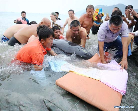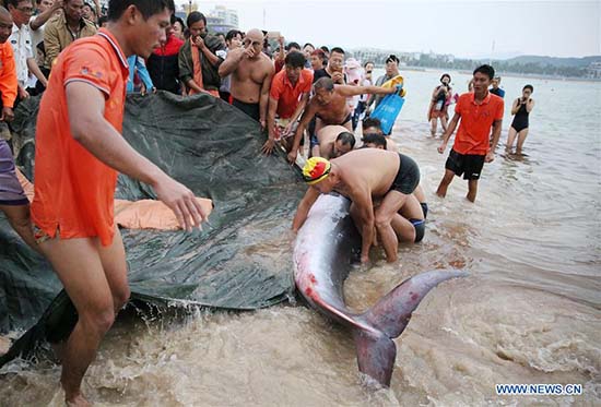Samedi 9 décembre, une baleine à bosse s'est échouée sur une plage de Sanya, dans la province du Hainan. Le mammifère marin de 3 mètres de long a été déplacé vers un lieu s?r par les secouristes.