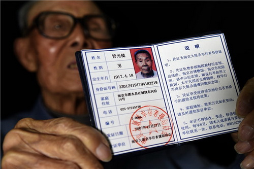 Guan montre son identification de survivant. Son témoignage oral concernant sa survie a été publié dans un livre en 2016. [Xinhua]