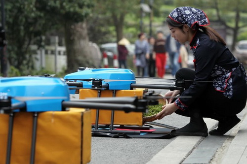 Le service lancé par le laboratoire de logistique Cainiao ET, filiale d'Alibaba, utilise des appareils sans pilote pour transporter les feuilles de thé depuis la montagne Shifeng, près du lac de l'Ouest de Hangzhou, jusqu'au centre de séchage en moins de deux minutes.