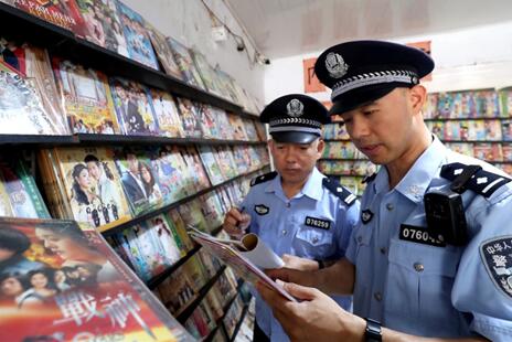 Des policiers du Bureau de la sécurité publique du canton de Xincai, dans la province du Henan, inspectent un magasin de produits audiovisuels du secteur, le 23 ao?t 2018. (Wang Yuxin / vip.people.com.cn)