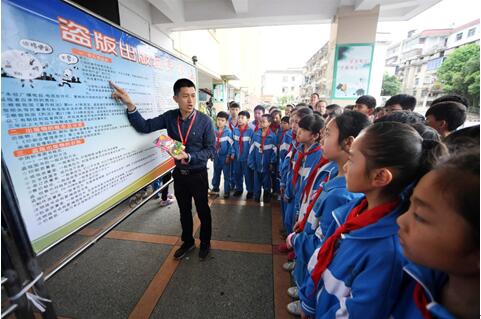 Le 23 avril 2018, des agents de la force publique du bureau de Wenguangxin du comté de Fenyi, à Xinyu, dans la province du Jiangxi, expliquent les méthodes de protection de la propriété intellectuelle et d'identification des publications piratées aux élèves de l'Ecole primaire n° 1 du comté de Fenyi. (Zhou Liang / vip.people.com.cn)