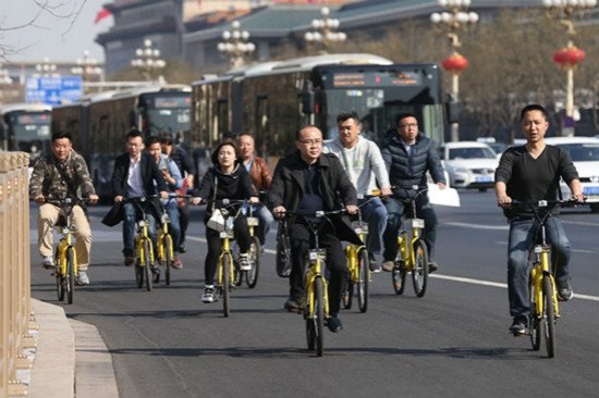 Un groupe de cyclistes sur des vélos Ofo passe sur l'avenue Chang'an, le 10 mars 2017 à Beijing. (Photo / China Daily)