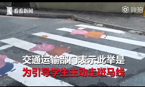 Afin d'encourager les élèves du primaire à utiliser les passages piétons lorsqu'ils traversent la rue, le service de contr?le de la circulation de Shenzhen, la métropole de la province du Guangdong (sud de la Chine), a peint des images de Peppa Pig sur un de ces passages devant une école primaire locale.