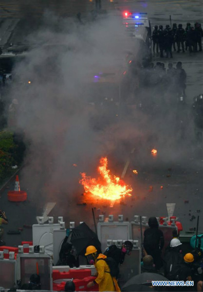 Des protestataires radicaux utilisent des cocktails Molotov contre la police à Tsuen Wan, dans l'ouest des Nouveaux Territoires de Hong Kong, en Chine, le 25 ao?t 2019. Les protestataires ont bloqué des routes, lancé des briques et des cailloux contre la police durant la manifestation. (Photo : Mao Siqian)