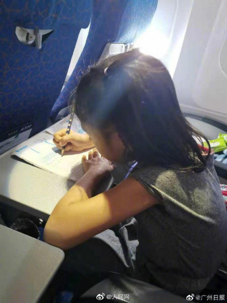 Sur un vol au décollage de Tourfan, dans la région autonome ou?ghoure du Xinjiang (nord-ouest de la Chine), à destination de la ville de Guangzhou, capitale de la province du Guangdong (sud de la Chine), presque tous les enfants d'age scolaire ont été vusen train de rattraper un retard sur leurs devoirs, a déclaré une passagère du nom de Hu au Guangzhou Daily.
