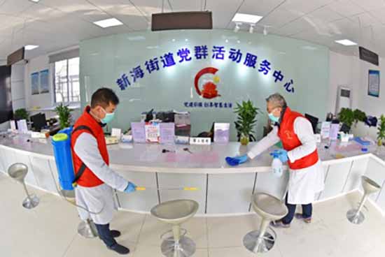 Le 2 février 2020, dans le centre de services de la rue Xinhai de l'arrondissement Haizhou de la ville de Lianyungang dans le Jiangsu, des agents d'hygiène professionnels sont en train de prendre des mesures de désinfection. (Geng Yu/people.com.cn)